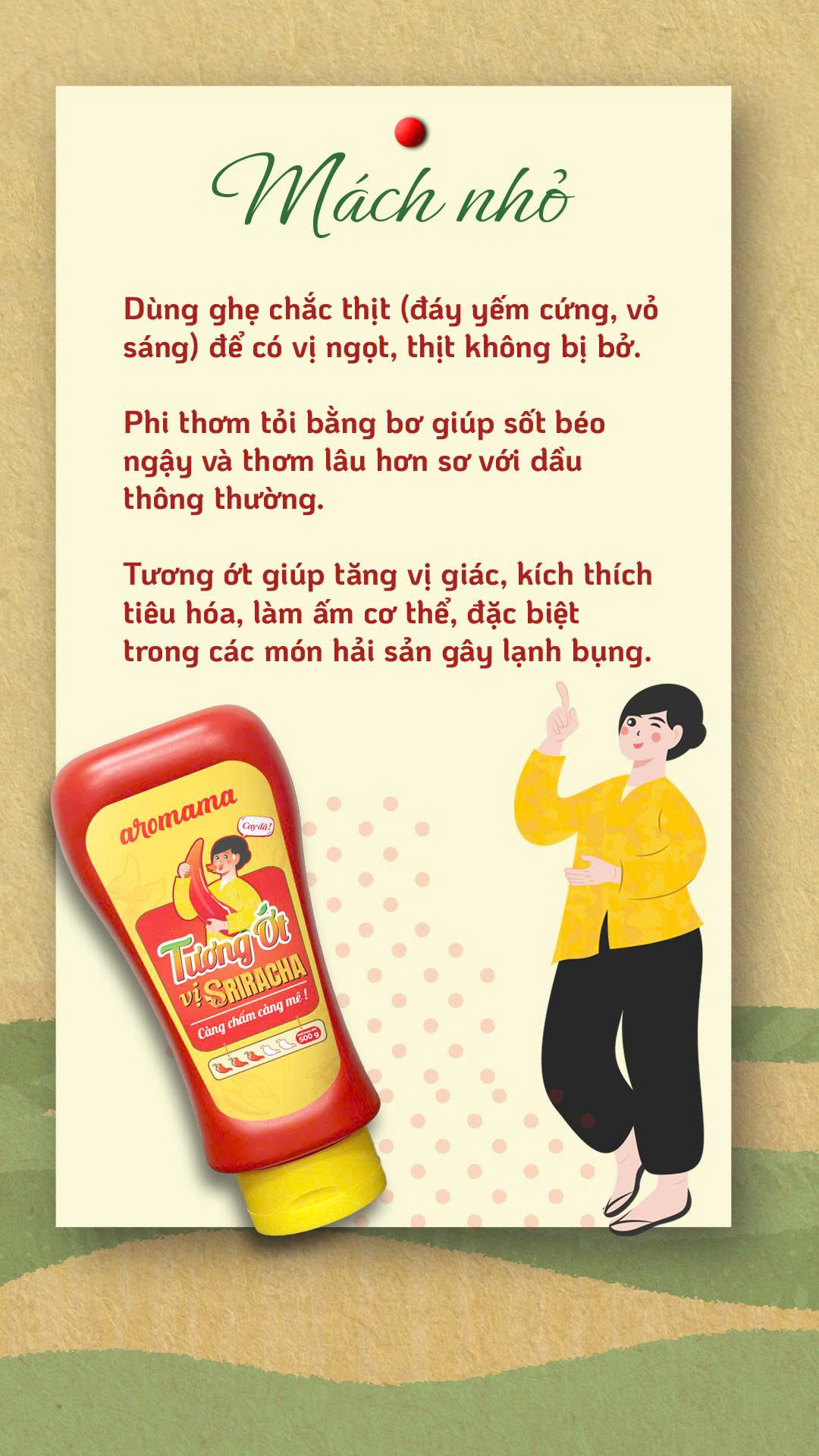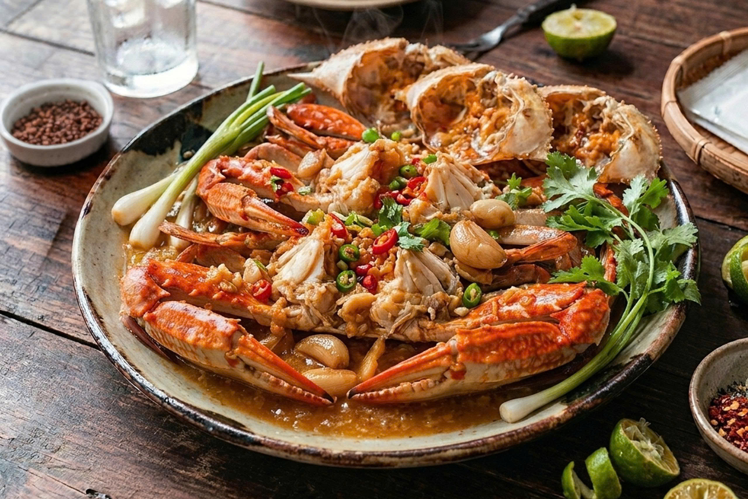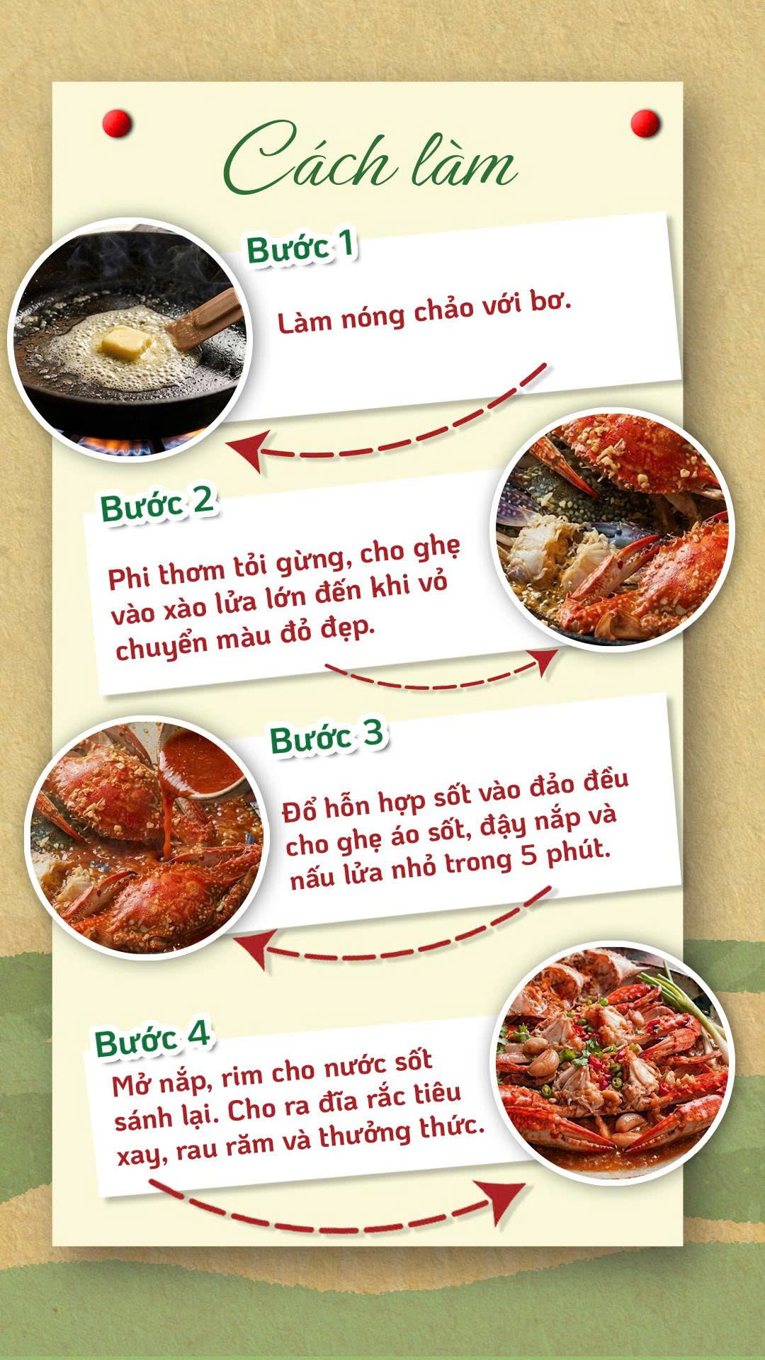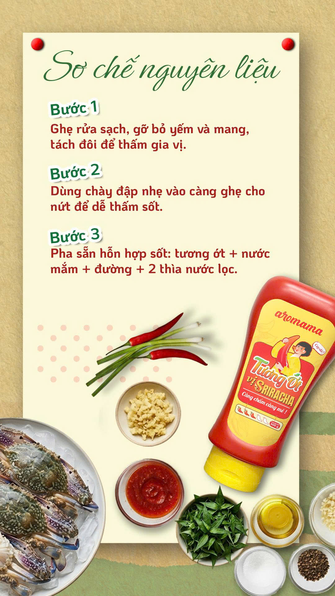 Ghẹ được mình chọn kỹ cho thật chắc thịt, đem rang trên lửa lớn để lớp vỏ dậy mùi thơm lừng, sau đó mới áo đều một lớp sốt tương ớt sóng sánh, có đủ vị cay-mặn-ngọt hài hòa. Điểm nhấn chính là những tép tỏi phi vàng bùi ngậy và vài lát ớt tươi kích thích vị giác. Từng thớ thịt ghẹ ngọt lịm quyện chặt trong lớp sốt đậm đà, chỉ cần nếm thử một miếng là thấy cả hương vị biển cả nồng nàn ngay thôi!